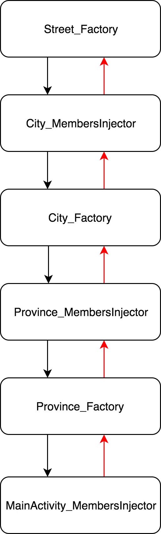 }这里的inject()和injectMembers()的工作和上面是一样的,调用BeaModule中的方法创建需要的实例,若该实例在创建时依赖其他实例,则调用BeaModule中的对应方法先创建依赖实例,直到找到源头,最大的区别就是在Xx_Factory中少了一步重新创建依赖的过程。用一张图来表示创建的过程就是