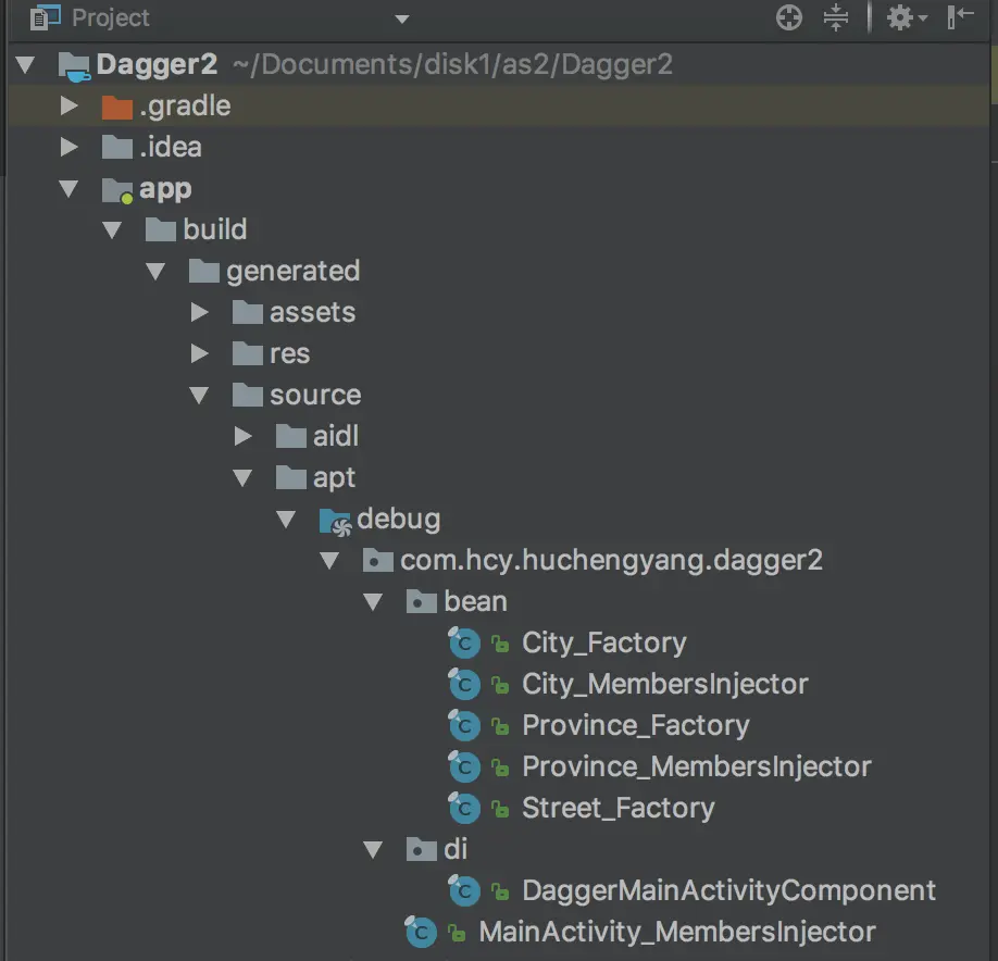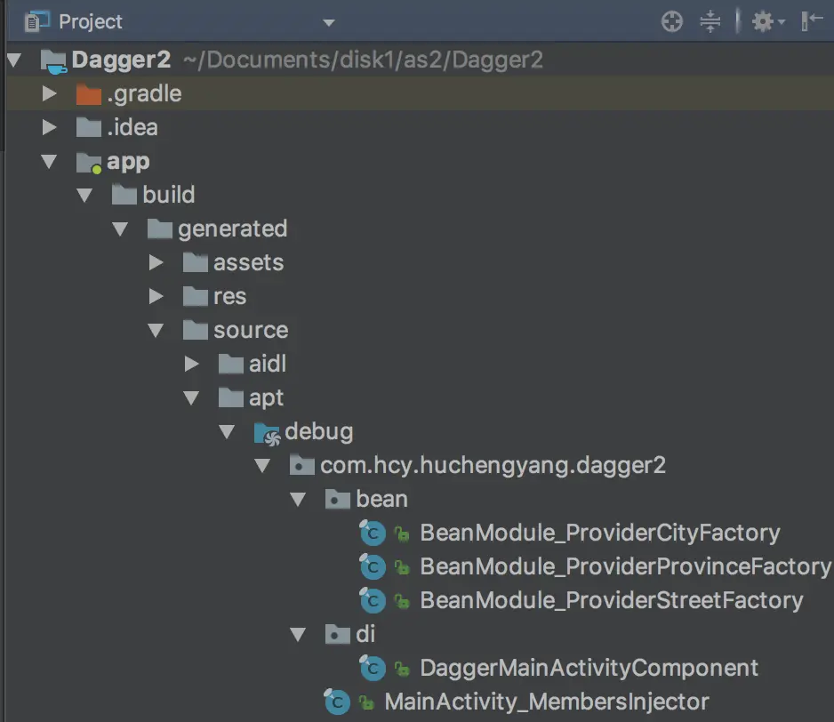 我们在MainaActivity中加了DaggerMainActivityComponent.create().inject(this)这句代码替换了之前的一些实例化的操作,那么这句代码具体做了哪些工作?原来Dagger2会在编译过程中生成对应的依赖项,这些依赖项在Android Studio该路径下,如图所示: