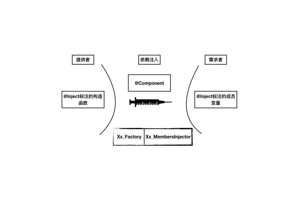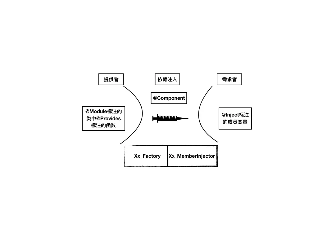 3.@Component标注的接口(Xx)在编译时生成DaggerXx,负责将上面两个联系起来。