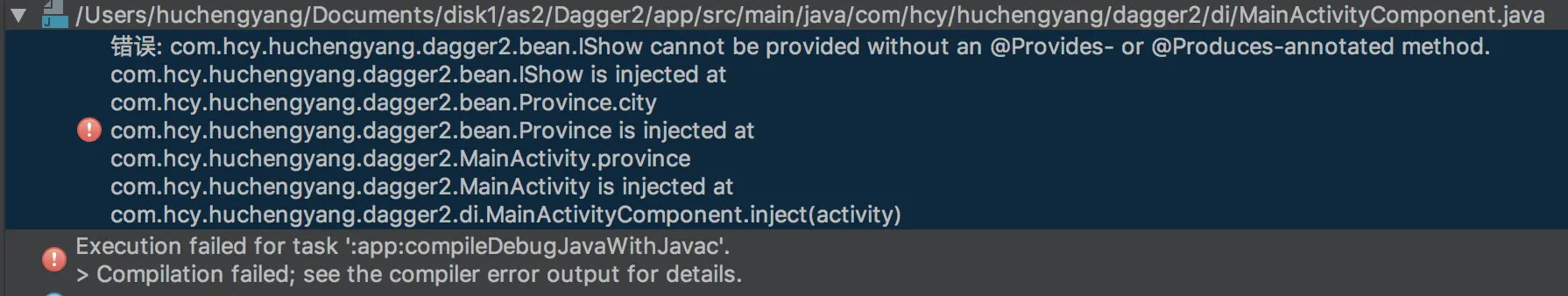 而配合使用@Module和@Provides则不会出现这种情况。问题又来了,如果依赖的提供方同时存在以@Inject标注和以@Module、@Providers标注,会找哪个?回到代码中,把两种写法都补充完整,要回答这个问题还是只有看源码了,通过编译可以看到生成的文件