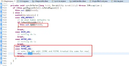 如果client设置的持久化等级是USER_DEFAULT,SYNC_WAL或FSYNC_WAL,那么工作线程的HRegion还将调用FSHLog的sync()方法: