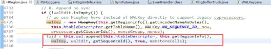 FSHLog的append方法首先会从LAMX Disruptor RingbBuffer中拿到一个序号作为txid(sequence),然后把WALEdit,WALKey和sequence等构建一个FSALEntry实例entry,并把entry放到ringbuffer中。而entry以truck(RingBufferTruck,ringbuffer实际存储类型)通过sequence和ringbuffer一一对应。