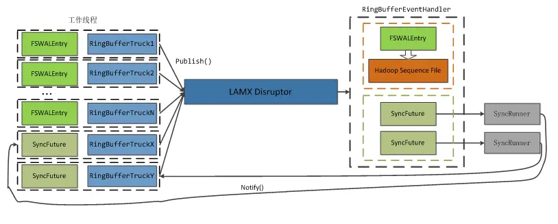 当调用append后WALEdit和WALKey会被封装成FSWALEntry类进而再封装成RinbBufferTruck类放入一个线程安全的Buffer(LMAX Disruptor RingBuffer)中。