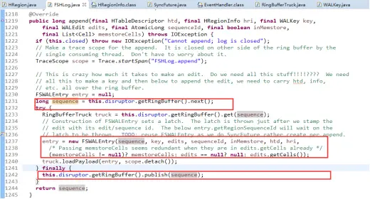 这部分源码可以看到append的最终归属就是根据sequence有序的把FSWALEntry实例entry写入HadoopSequence文件。这里有序的原因是多工作线程写之前通过ringbuffer线程安全的CAS得到一个递增的sequence,ringbuffer会根据sequence取出FSWALEntry并落盘。这样做其实只有在得到递增的sequence的时候需要保证线程安全,而java的CAS通过轮询并不用加锁,所以效率很高。具体有关ringbuffer说明和实现可以参考LMAX Disruptor文档。