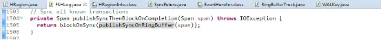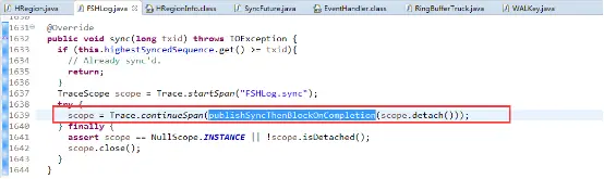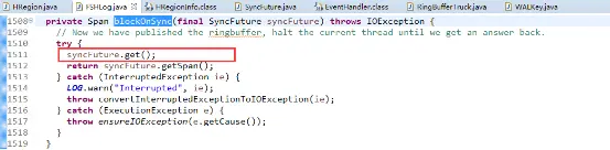 追踪代码可以分析出Sync()方法会往ringbuffer中放入一个SyncFuture对象,并阻塞等待完成(唤醒)。