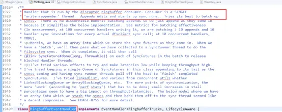 像模型图中所展示的多个工作线程封装后拿到由ringbuffer生成的sequence后作为生产者放入ringbuffer中。在FSHLog中有一个私有内部类RingBufferEventHandler类实现了LAMX Disruptor的EventHandler接口,也即是实现了OnEvent方法的ringbuffer的消费者。Disruptor通过 java.util.concurrent.ExecutorService 提供的线程来触发 Consumer 的事件处理,可以看到hbase的wal中只启了一个线程,从源码注释中也可以看到RingBufferEventHandler在运行中只有单个线程。由于消费者是按照sequence的顺序刷数据,这样就能保证WAL日志并发写入时只有一个线程在真正的写入日志文件的可感知的全局唯一顺序。