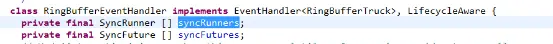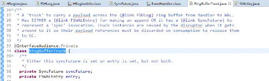 这部分源码可以看到RingBufferTruck类的结构,从注释可以看到选择SyncFuture和FSWALEntry一个放入ringbuffer中。