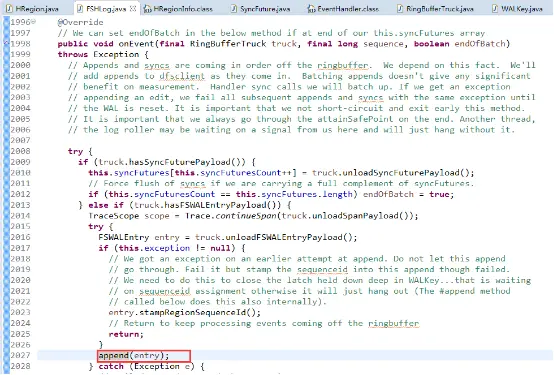工作线程中当HRegion准备好一个行事务“写”操作的,WALEdit,WALKey后就会调用FSHLog的append方法: