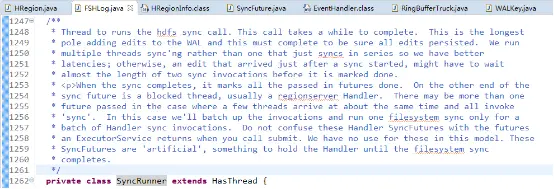 这部分源码是说明sync操作的SyncFuture会被提交到SyncRunner中,这里可以注意SyncFuture实例其实并不是一个个提交到SyncRunner中执行的,而是以syncFutures(数组,多个SyncFuture实例)方式提交的。下面这部分源码是注释中说明批量刷盘的决策。