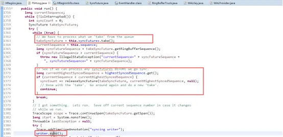SyncRunner的线程方法(run())负责具体的刷写文件缓存到磁盘的工作。首先去之前提交的synceFutues中拿到其中sequence最大的SyncFuture实例,并拿到它对应ringbuffer的sequence。再去比对当前最大的sequence,如果发现比当前最大的sequence则去调用releaseSyncFuture()方法释放synceFuture,实际就是notify通知正被阻塞的sync操作,让工作线程可以继续往下继续。