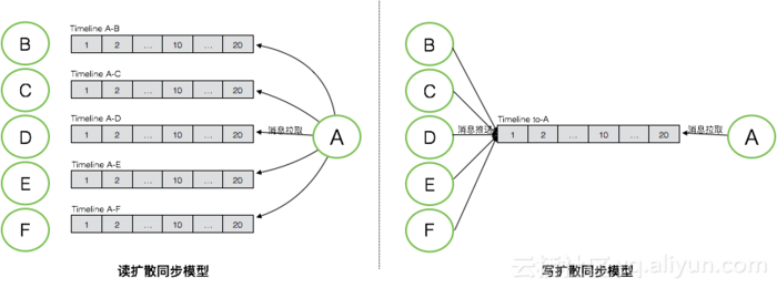 消息同步模型会比消息存储模型稍复杂一些,消息的同步一般有读扩散和写扩散两种不同的方式,分别对应不同的Timeline物理模型。