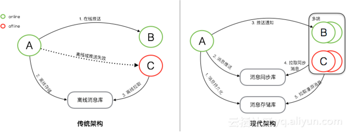 消息的同步:将消息完整的、快速的从发送方传递到接收方,就是消息的同步。消息同步系统最重要的衡量指标就是消息传递的实时性、完整性以及能支撑的消息规模。从功能上来说,一般至少要支持在线和离线推送,高级的IM系统还支持『多端同步』。