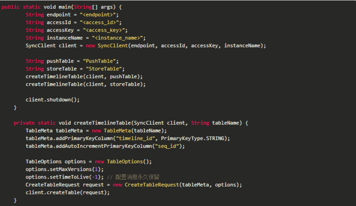 以上是创建Timeline表的示例代码,总共需要创建两张表,一张表作为消息同步库,名称为『PushTable』,另一张表作为消息存储库,名称为『StoreTable』。