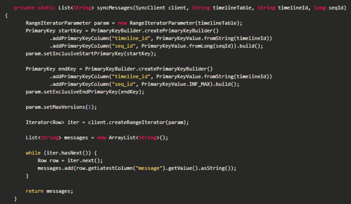 本章会以一段非常精简的代码,来展示如何基于TableStore实现Timeline模型,并基于Timeline模型进行消息存储和推送。