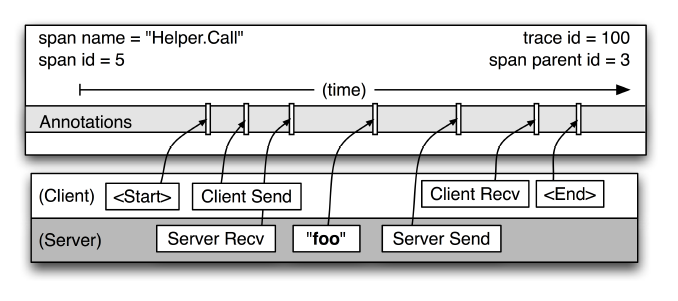 图3给出了一个更详细的典型的Dapper跟踪span的记录点的视图。在图2中这种某个span表述了两个“Helper.Call”的RPC(分别为server端和client端)。span的开始时间和结束时间,以及任何RPC的时间信息都通过Dapper在RPC组件库的植入记录下来。如果应用程序开发者选择在跟踪中增加他们自己的注释(如图中“foo”的注释)(业务数据),这些信息也会和其他span信息一样记录下来。