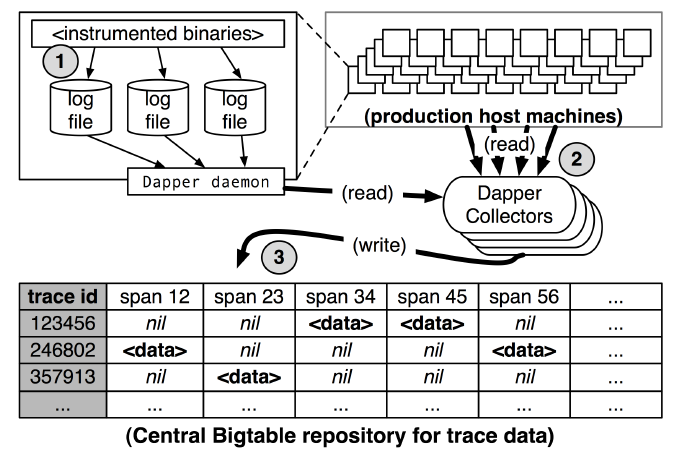 Dapper的跟踪记录和收集管道的过程分为三个阶段(参见图5)。首先,span数据写入(1)本地日志文件中。然后Dapper的守护进程和收集组件把这些数据从生产环境的主机中拉出来(2),最终写到(3)Dapper的Bigtable仓库中。一次跟踪被设计成Bigtable中的一行,每一列相当于一个span。Bigtable的支持稀疏表格布局正适合这种情况,因为每一次跟踪可以有任意多个span。跟踪数据收集(即从应用中的二进制数据传输到中央仓库所花费的时间)的延迟中位数少于15秒。第98百分位的延迟(The 98th percentile latency)往往随着时间的推移呈现双峰型;大约75%的时间,第98百分位的延迟时间小于2分钟,但是另外大约25%的时间,它可以增涨到几个小时。