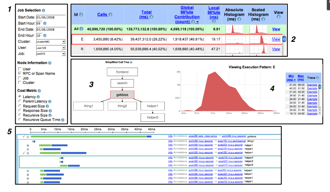 - 在生成与步骤1中选中的成本度量(cost metric)维度相关的统计信息之后,Dapper的用户界面会提供了一个简单的直方图。在这个例子中,我们可以看到一个大致的所选中部分的分布式响应时间分布图。用户还会看到一个关于具体的跟踪信息的列表,展现跟踪信息在直方图中被划分为的不同区域。在这个例子中,用户点击列表种第二个跟踪信息实例时,会在下方看到这个跟踪信息的详细视图(步骤5)。