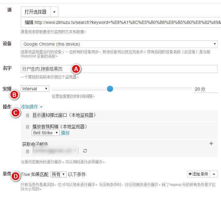 4、之后会来到详细的设置页面,比如名字——这样方便你以后管理;安排——可以对监控的间隔进行调整,比如最短5秒或最长30天,也可以改为永不更新,以后想更新了再编辑即可;操作——这里可以设置提醒的方式,比如弹窗,提示音,电子邮件等等(部分需要付费才可以使用);条件——再条件中还可以对变化的结果进行进一步的过滤,比如里面出现某个文字才提示。在完成详细的设置后,别忘了保存。
