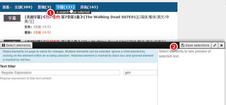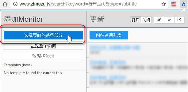 2、由于这个页面的更新时间有用到“X天前”,如果使用完整网页监控的话,就会监控到很多无用数据。所以,选择导航上面的“字幕(121)”即可,这样新的字幕只要发布,这个121就会增加。我们点击Chrome地址栏右侧的Distill Web Monitor 图标,选择“选择监控网页的某些部分”