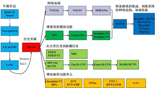以卷积神经网络为例,我们用图2来展示入门需要掌握的知识。起点是Hubel和Wiesel的对猫的视觉皮层的研究,再到日本学者福岛邦彦神经认知机模型(已经出现了卷积结构),但是第一个CNN模型诞生于1989年,1998年诞生了后来被大家熟知的LeNet。随着ReLU和Dropout的提出,以及GPU和大数据所带来的历史机遇,CNN在2012年迎来了历史性的突破——诞生了AlexNet网络结构。2012年之后,CNN的演化路径可以总结为四条:1. 更深的网络;2. 增强卷积模的功能以及上诉两种思路的融合ResNet和各种变种;3. 从分类到检测,最新的进展为ICCV 2017的Best Paper Mask R-CNN;4. 增加新的功能模块。