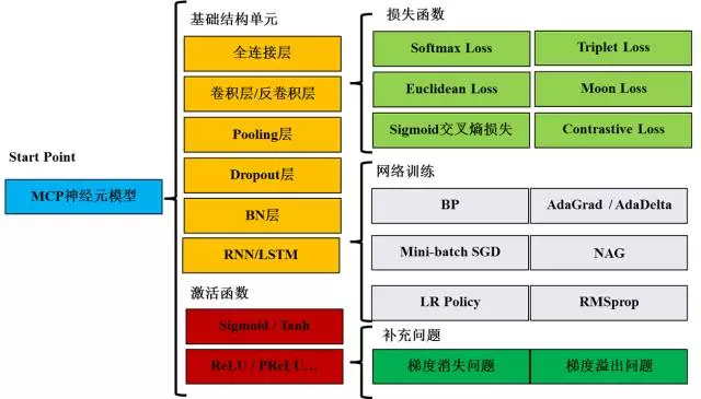 深度学习理论入门:我们可以用一张图(图1)来回顾深度学习中的关键理论和方法。从MCP神经元模型开始,首先需要掌握卷积层、Pooling层等基础结构单元,Sigmoid等激活函数,Softmax等损失函数,以及感知机、MLP等经典网络结构。接下来,掌握网络训练方法,包括BP、Mini-batch SGD和LR Policy。最后还需要了解深度网络训练中的两个至关重要的理论问题:梯度消失和梯度溢出。
