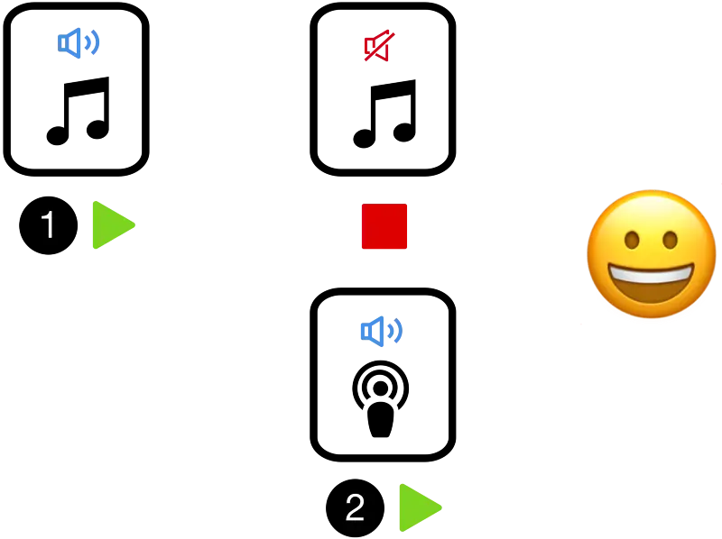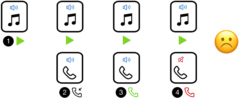您的音频1和另一个应用的音频2会重叠播放,用户无法正常听到来自任何应用的音频,这样的用户体验很不友好。