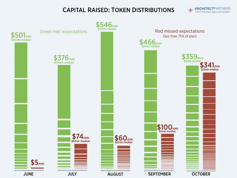 新闻标题依旧那么积极正面。 在 2017 年 10 月,76 个项目完成了他们的 ICO,筹集了相当于 7 亿美元的资金,创纪录的一个月。 然而,正如我们上个月观察到的,市场变得更有选择性了,只有 26 个项目,总量的 34%,完成了他们的集资目标,创了新低。另外,我们相信至少还有几十个项目宣布进行 ICO,但是公开后一直保持沉默。以上这些发现都和我们经历的传闻一致。