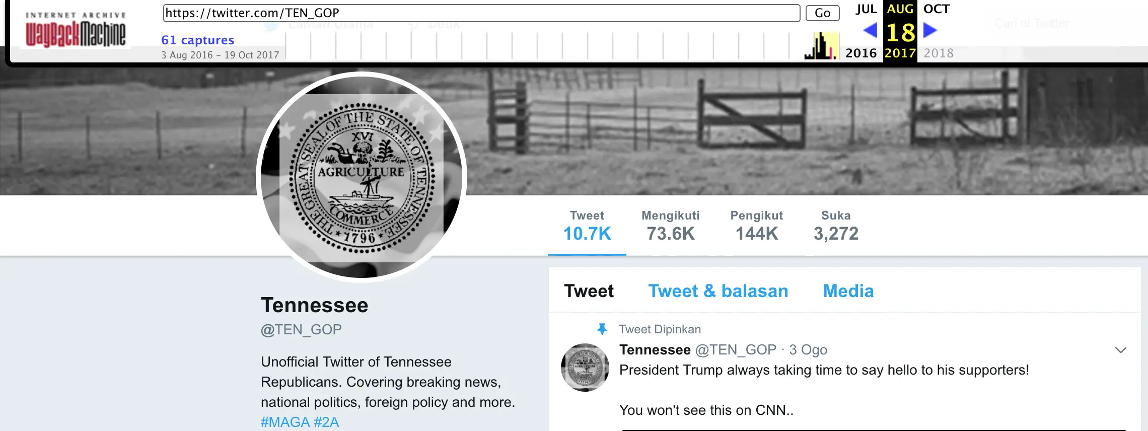 For example, if you visit web.archive.org/web/2017081… we can see the Twitter page for @TEN_GOP, one of the Russia Troll accounts that was designed to look like an account associated with the Tennessee Republican party.