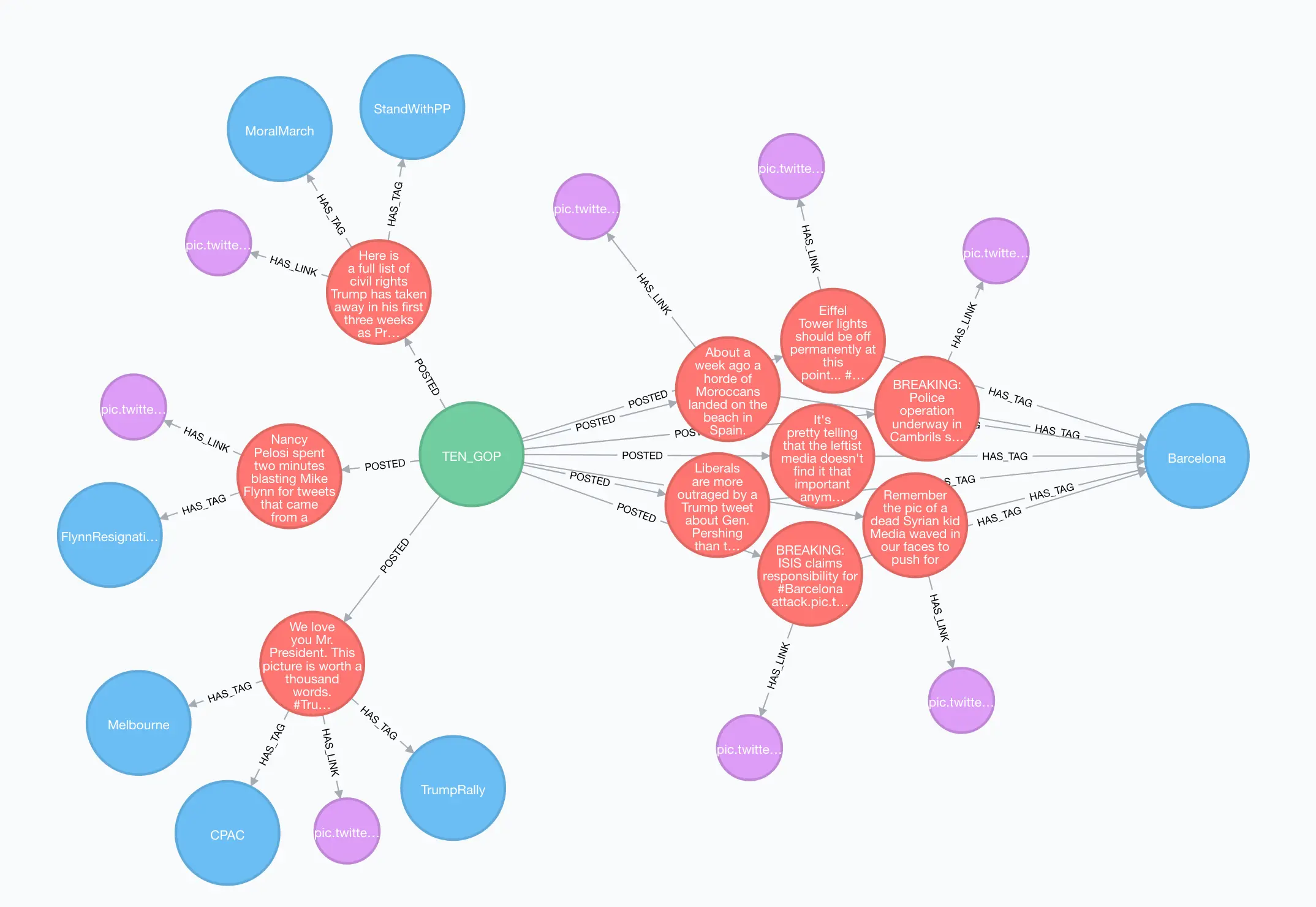12 Nov 2017Last week as a result of the House Intelligence Select Committee investigation, Twitter released the screen names of 2752 Twitter accounts tied to Russia’s Internet Research Agency that were involved in spreading fake news, presumably with the goal of influencing the 2016 election. In this post we explore how to scrape tweets from the user pages of cached versions of these pages, import into Neo4j for analysis, and how to build a simple GraphQL API exposing this data through GraphQL.