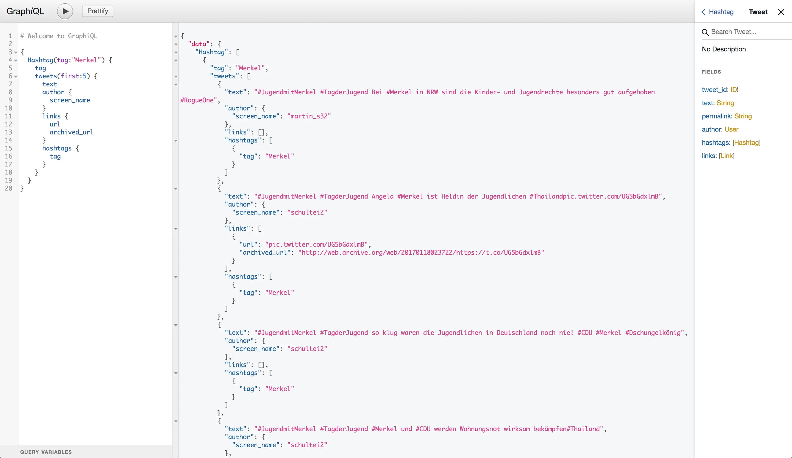 Our GraphQL schema defines the types and fields available in the data, as well as the entry points for our GraphQL service. In this case we have a single entry point Hashtag, allowing us to search for tweets by hashtag.