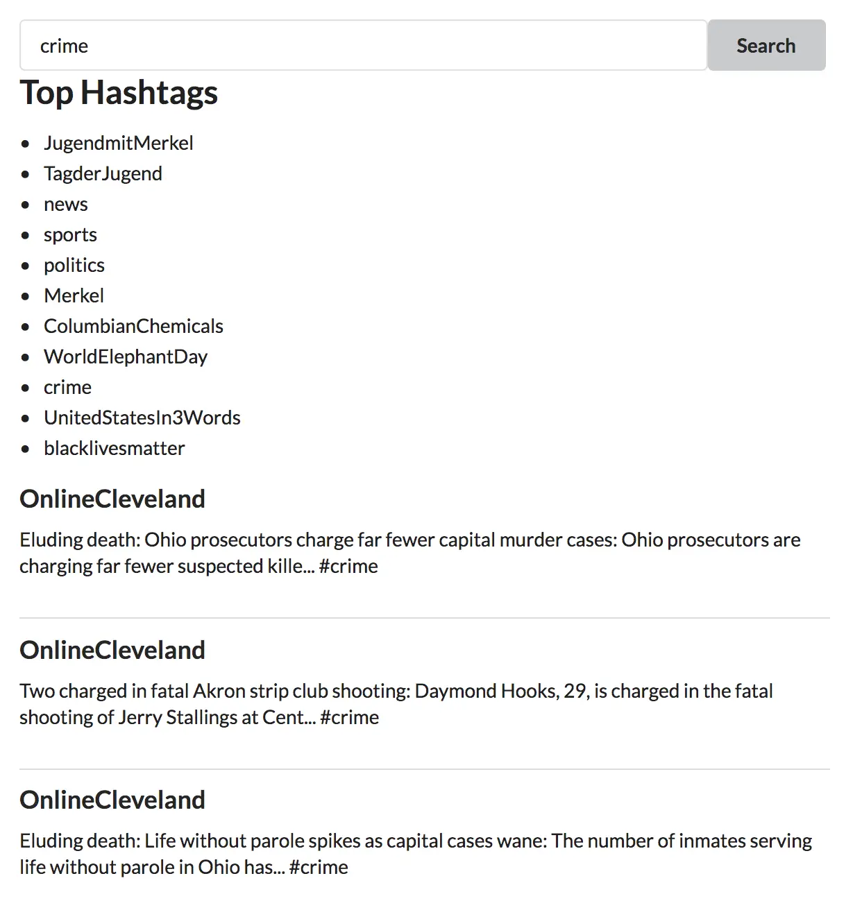 One of the advantages of having a GraphQL API is that makes it very easy to build web and mobile applications that consume the GraphQL service. To make the data easily searchable we’ve make a simple React web app that allows for searching tweets in Neo4j by hashtag.