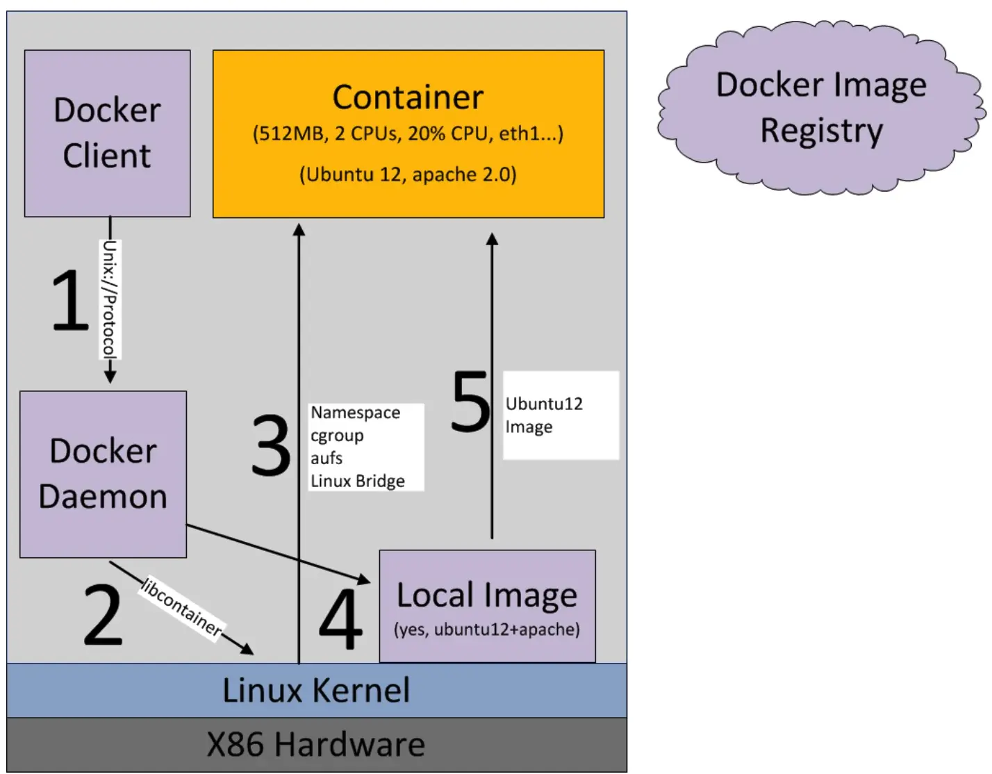 这一节我们来稍微了解下docker原理性的东西 docker run -i -t ubuntu /bin/bash 输入上面这行命令,启动一个ubuntu容器时,到底发生了什么? 大致过程可以用下图描述: 首先系统要有一个docker daemon的后台进程在运行,当刚才这行命令敲下时, 1.这一节我们来稍微了解下docker原理性的东西