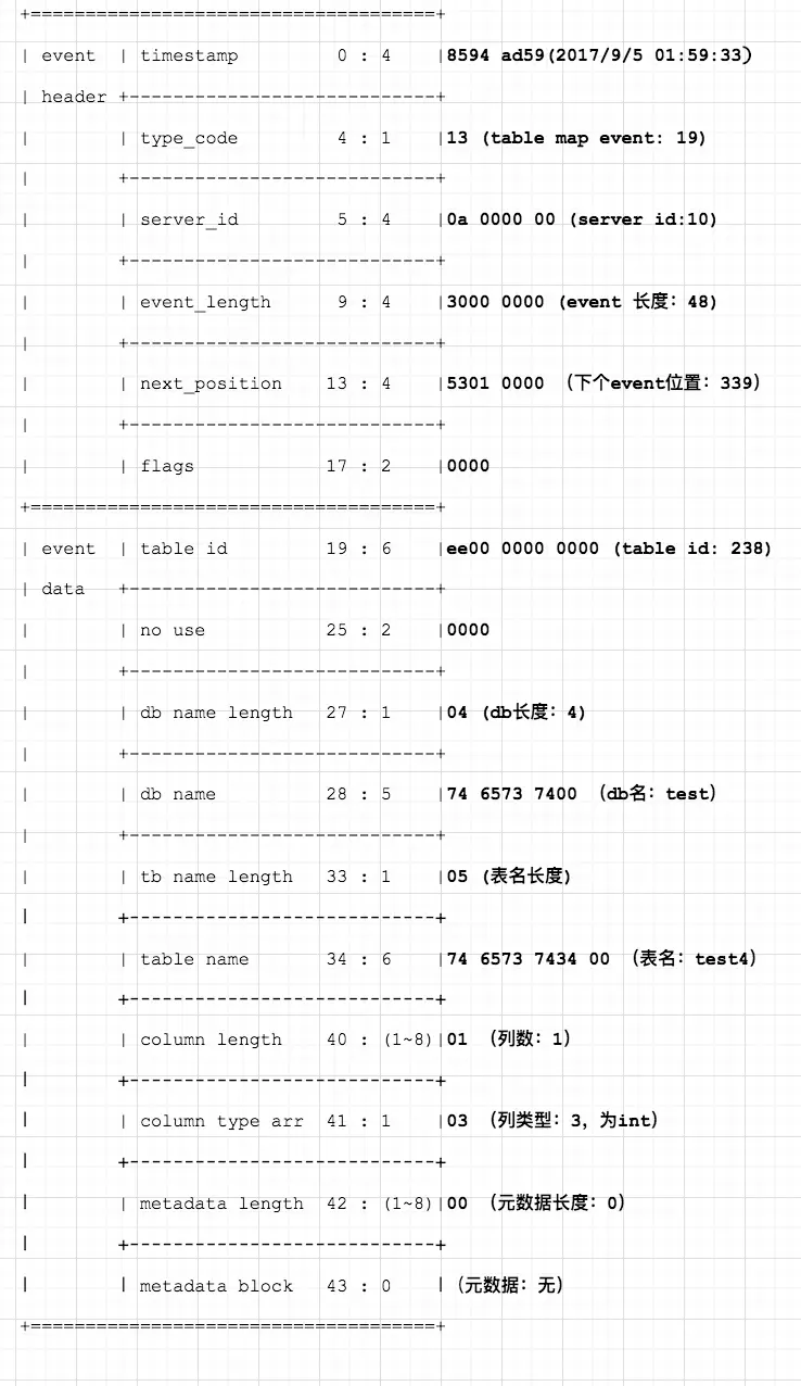 binlog中一个或者多个字节组合,分别表示了不同的含义。比如,timestamp是由固定的4个字节组成,event类型由一个字节表示;数据库名和表名最长为64个字符,即使每个字符占用3个字节,那么占用的字节数为192<255。因此最多使用一个字节,就可以完成实际长度表示。