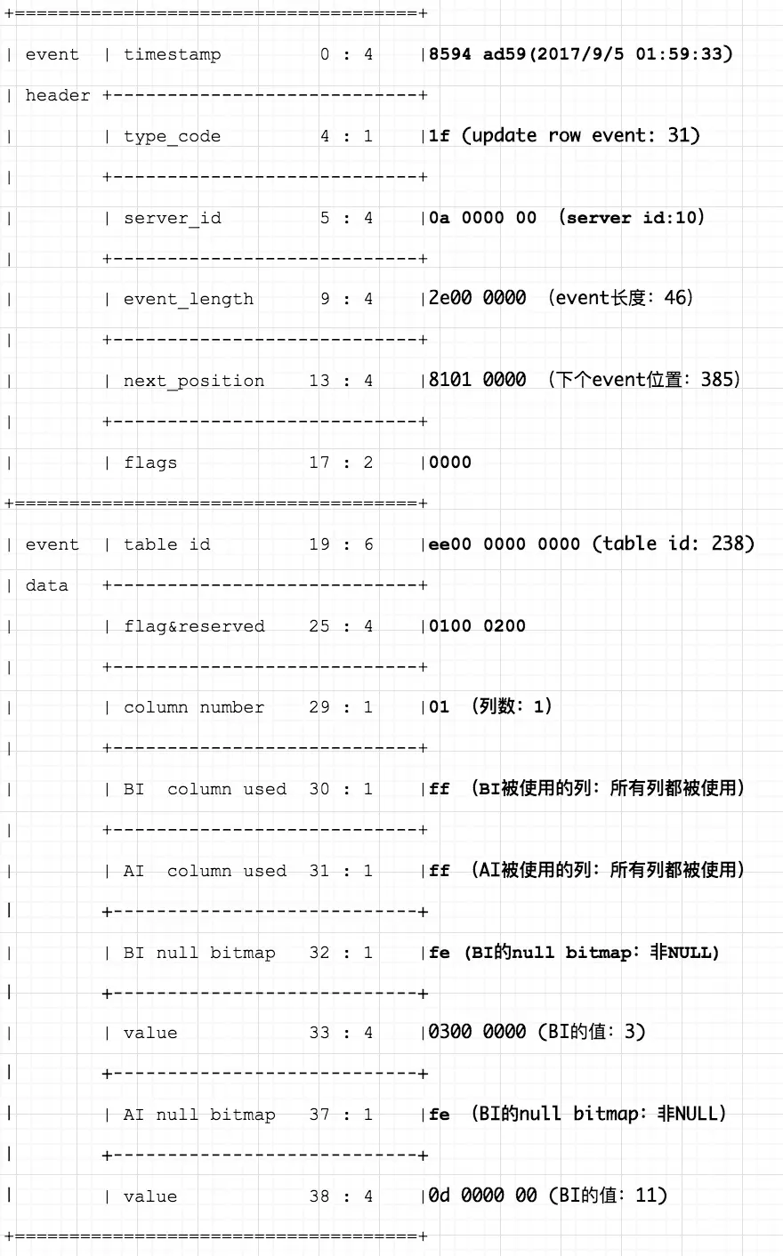 比如在binlog格式概览一节中,介绍了table_map_event和update_row_event。如果只有update_row_event,那么我们无法知道这个event对应的行记录变更对应的表。因此一个完整的最小执行单元最少包含一个table_map_event和write_row_event、update_row_even、delete_row_event中的一个。