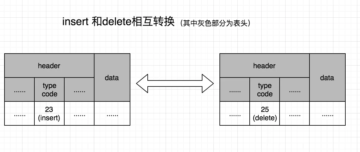 根据上面的binlog介绍,可以看到每个binlog event中event header有个type_code,其中insert为30,update为31,delete为32。对于insert和delete两个相反的操作,只需把type_code互换,则在binlog event级别完成回滚。