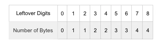 - 小数部分,需要的字节数为 (10 /9)*4+Fnum(10%9)=5。