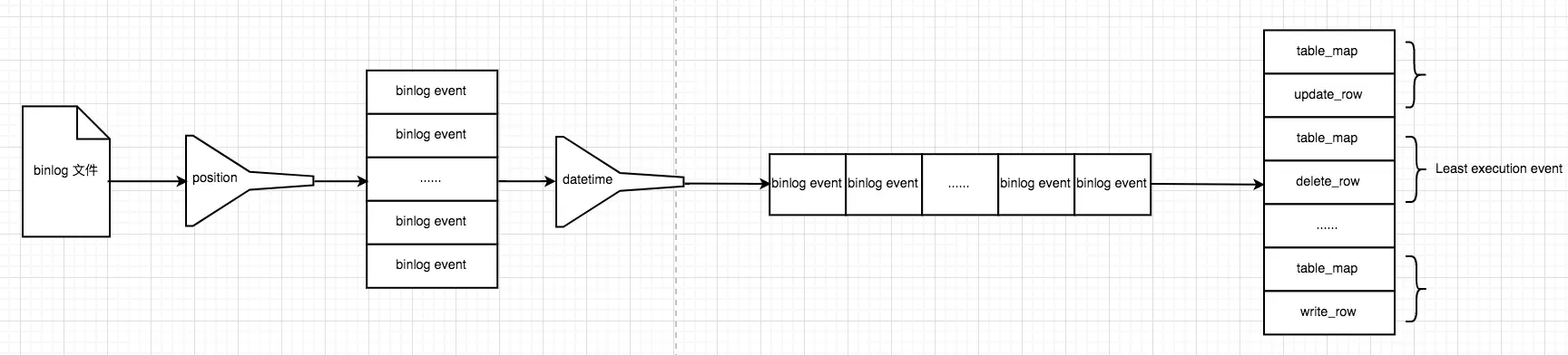 首先把binlog文件,解析成多个event,放入到相关队列中。在实现上,为了尽可能加快解析速度,可以让用户指定解析的开始与结束位置。把binlog文件解析成binlog event后,再判断下是否符合指定的时间条件,若不符合,则丢弃该event。