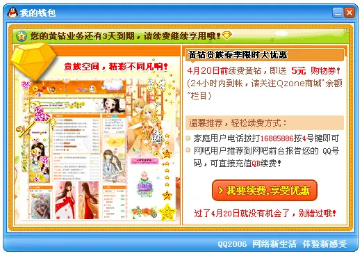 当用户的黄钻贵族身份即将到期的时候,从QQ聊天主面板上的“我的钱包”提示:“钱包”闪动,点击后用一个490*300px的小窗口告知用户续费的详情。