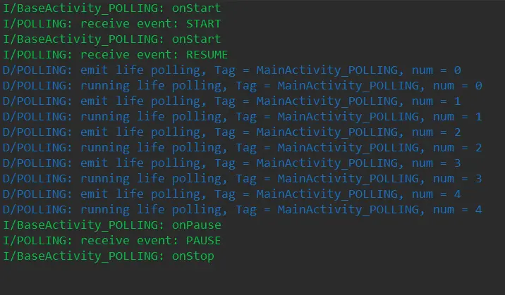 上面这个例子监听PAUSE事件,在Activity进入onPause时会停止轮询,看下日志打印情况:
