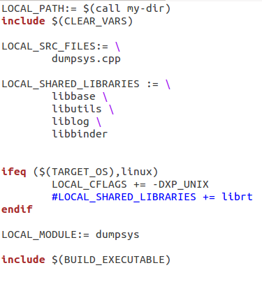 dumpsys源码位置:frameworks/native/cmds/dumpsys首先我们先看下这里的Android.mk,先看这个文件的目的是,我们要看下这个目录到底怎么组织,哪些文件参与编译,同时最终生成了什么内容,生成在哪里。