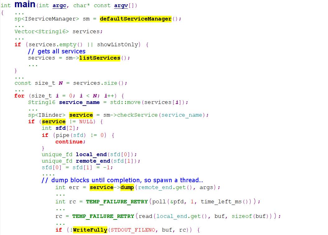 这里LOCAL_SRC_FILES: 指定了参与编译的文件列表LOCAL_SHARED_LIBRARIES 指定了依赖的动态库 LOCAL_MODULE 指定了编译出来的名字include $(BUILD_EXECUTABLE) 指定了是个可执行文件,默认的位置在system/bin看完了这些,那我们找到源码 dumpsys.cpp,来看下这个具体的代码。因为最终编出来是可执行文件,那么标准的c程序,需要入口 main方法的,这里我们看下