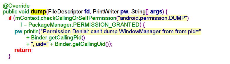 通过将文件句柄,进行包装,再次调用本身的dump(三个参数),这里就会执行对应服务的dump方法了,比如WMS就是WindowManagerService.java的dump: