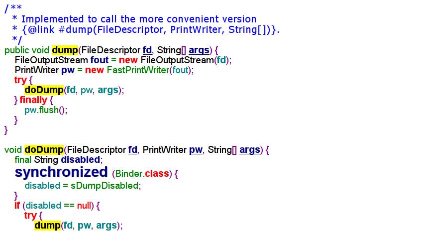 我们发现和我们 本身传入的参数不一样,我们本身传入的为service->dump(remote_end.get(), args) ,这里系统帮我们隐藏了binder的具体关联,这里我们直接调用的dump方法,在binder.java里面: