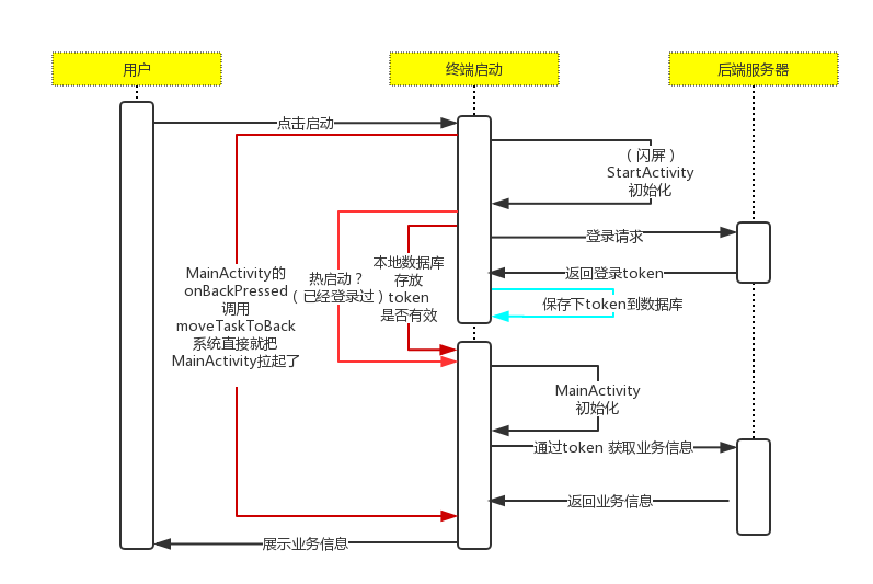 App 回退到后台时候,进程是不一定被回收的,系统资源紧张时候后台进程才可能被回收。还在运行的App,再次点击桌面打开时候,这个过程是热启动了,这里有个很明显的优化点,已经登录过了的进程,再次进入StartActivity 时候是没有必要再次发起登录请求了的,进入步骤2 时候,应该先判断下内存有没有登录过了的token了,如果有,步骤2、3 不用再次登录了,直接进入步骤4即可。