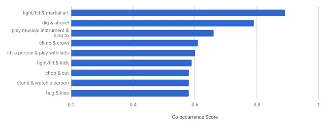 AVA 的独特设计可让我们推导出其他现有数据集中没有的一些有趣统计信息。例如,如果很多人至少有两个标签,我们便可测量动作标签的共现模式。下图所示为 AVA 中最常见的共现动作对及其共现得分。我们确认预期模式,比如人们经常在唱歌时弹奏乐器,跟小孩玩时把人举起,以及在亲吻时拥抱,等等。