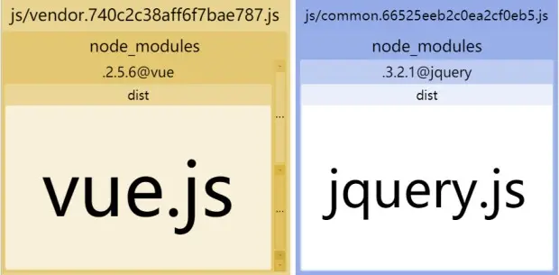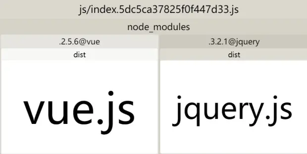 可以看到 vue 与 jquery 被分开打包成了两个文件,我们尝试添加一下新的依赖 vuex,打包后结果如下: