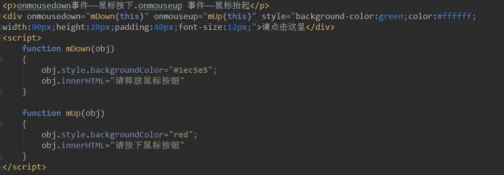 当点击鼠标按钮时,会触发onmousedown事件(改变背景色,改变文本内容),当释放鼠标按钮时,会触发onmouseup事件(改变背景色,改变文本内容)。