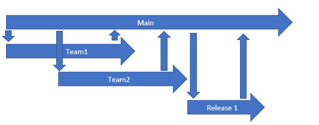 先简单介绍下我们的版本控制工具:微软的TFVC,代码的branch是按如下图创建的,有一个main branch每个scrum team一个branch,出release之前把各个team的branch merge回main,最后出release branch,release branch上修复的bug也要最终回main。