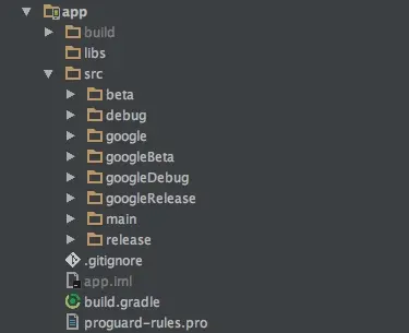 如我们的主资源集src/main,AS会默认创建main/主资源集目录,用于存储要在所有构建类型、产品风味、构建变体之间共享的资源,我们项目中的主要资源也位于主资源集目录下,当我们新建一个buildType或productFlavor时,gradle也会相应的创建一个对应的资源集,该资源集的名称和构建类型、产品风味的名称一样,位于src目录下,只不过这需要我们手动创建对应的目录添加需要的资源,当构建类型和产品风味都存在时,gradle还会把它们进行组合成一个buildVariant构建变体,名称为产品风味与构建类型的名称的组合,gradle也会为构建变体创建一个资源集,名称和构建变体名称一样,所以,在创建了一个beta构建类型和google产品风味的情况下,共有如下的资源集: