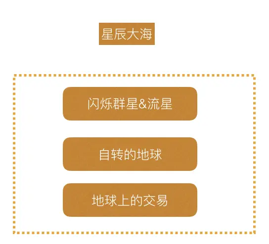 ok 以上就是 闪烁的繁星, 天边划过的流星, 旋转的地球, 呼吸的交易线 按对应位置组合在一起, 就是星辰大海了。 当然 看到这里 你可能会问, 星辰有了 但是 说好的大海呢, 其实有的 你仔细看 地球表面都是水啊,那就是海。
